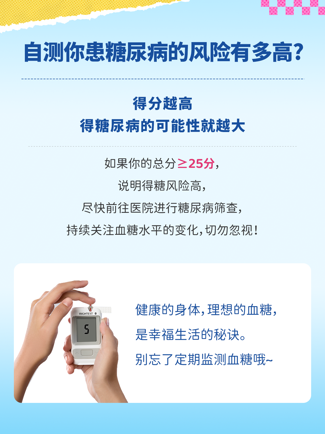 你的分數(shù)是多少?快來自測并重視血糖健康吧!早篩查,早預防,健康生活從今天開始~