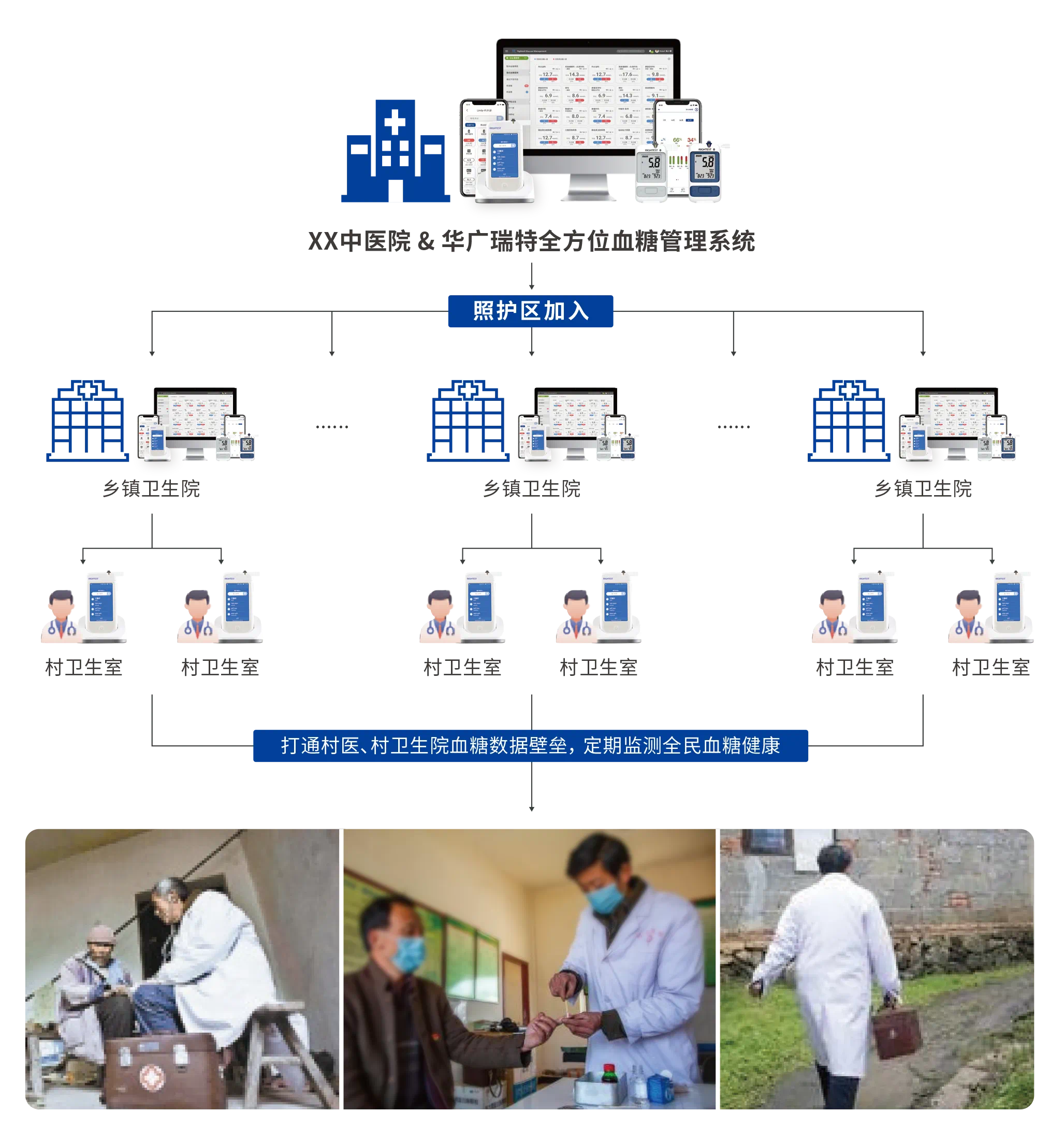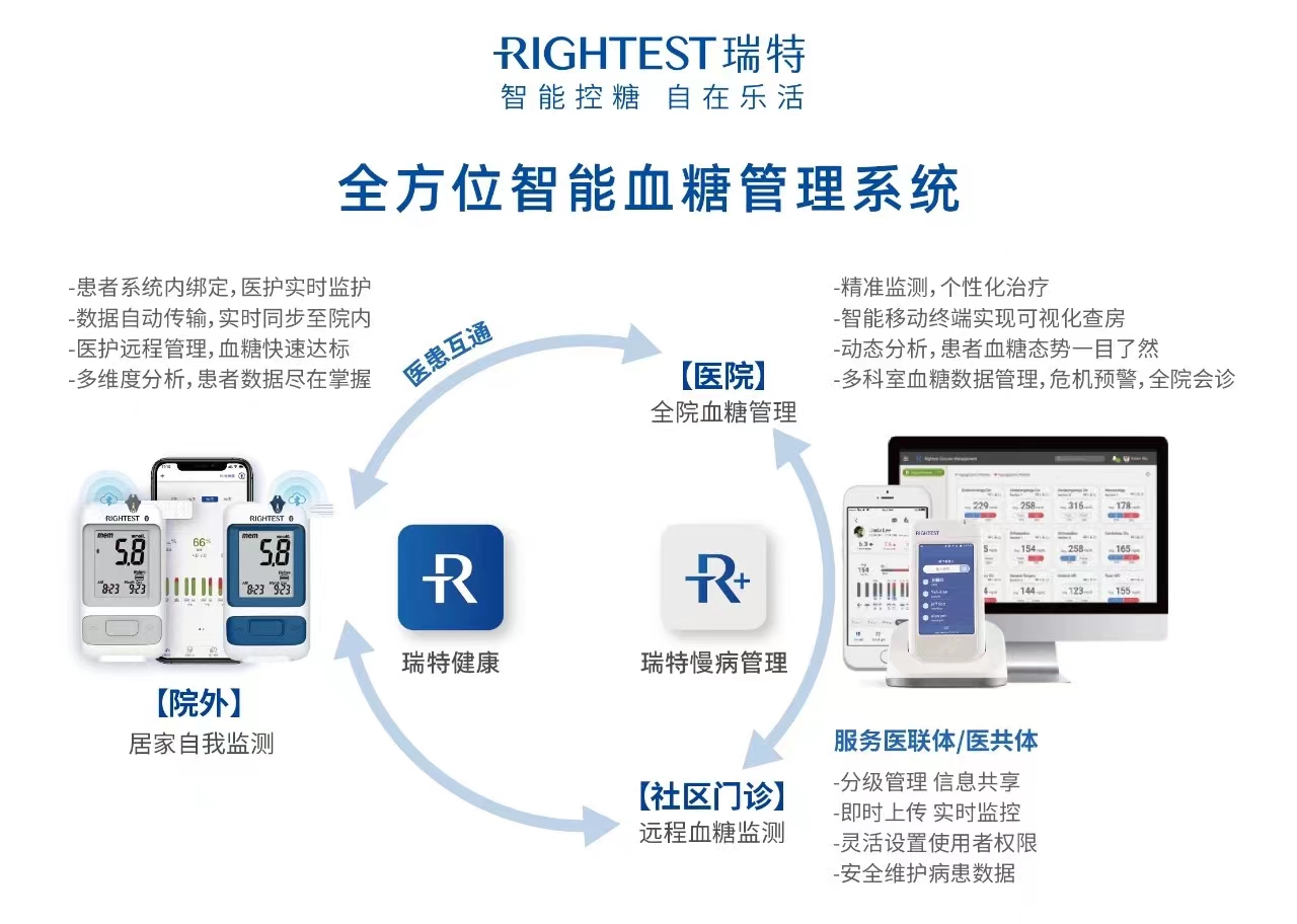 實(shí)現(xiàn)醫(yī)生遠(yuǎn)程照護(hù)瑞特全方位智能血糖管理系統(tǒng)圍繞血糖健康管理用戶(hù)(醫(yī)生+患者),從預(yù)防到治療到后期管控,做到診前、診中、診后服務(wù)體驗(yàn)全覆蓋,融合門(mén)診、住院、出院、居家全病程全場(chǎng)景全流程血糖管理閉環(huán)。不論是醫(yī)師還是患者,皆能感受到智能信息化服務(wù)帶來(lái)的便利性與主動(dòng)式統(tǒng)計(jì)、分析與服務(wù)。對(duì)于糖尿病患者在診前、診中、診后全病程全流程血糖監(jiān)測(cè)管理服務(wù),出院患者在家使用瑞特血糖儀監(jiān)測(cè)血糖,通過(guò)手機(jī)應(yīng)用程序(APP/小程序)綁定主治醫(yī)生。不僅可以實(shí)現(xiàn)血糖數(shù)據(jù)的實(shí)時(shí)同步、分析7天、14天、30天、90天血糖趨勢(shì)、記錄控糖日記、智能測(cè)糖提醒,更是能鏈接醫(yī)院端瑞特血糖管理系統(tǒng),這樣用戶(hù)居家監(jiān)測(cè)血糖,醫(yī)生在線即可針對(duì)用戶(hù)日常血糖波動(dòng)和飲食狀況,提出控糖建議、發(fā)送隨訪通知等,真正做到醫(yī)生遠(yuǎn)程照護(hù),讓更多人擁抱健康。 為加快實(shí)現(xiàn)醫(yī)療資源上下貫通、信息互通共享、業(yè)務(wù)高效協(xié)同,瑞特血糖管理系統(tǒng)以信息化建設(shè)為落腳點(diǎn),建立“三級(jí)醫(yī)院糖尿病診療中心+二級(jí)區(qū)級(jí)醫(yī)院+基層醫(yī)療衛(wèi)生服務(wù)機(jī)構(gòu)+家庭醫(yī)生”糖尿病一體化管理模式(“四位一體”模式),打通了“市-區(qū)-社區(qū)”三級(jí)服務(wù)流程,實(shí)現(xiàn)“以人為核心”的整合型全程血糖健康管理,有效推動(dòng)糖尿病分級(jí)診療工作的切實(shí)落地,提升區(qū)域慢性病服務(wù)管理水平。伴隨血糖智能管理全鏈路的逐級(jí)打通,不僅可以針對(duì)病患搭建多場(chǎng)景應(yīng)用服務(wù),可全面采集精準(zhǔn)醫(yī)療數(shù)據(jù),形成可供臨床診斷的電子健康檔案;還能夠?qū)崿F(xiàn)上下級(jí)醫(yī)療系統(tǒng)與平臺(tái)的對(duì)接,并進(jìn)行動(dòng)態(tài)監(jiān)管和持續(xù)健康干預(yù),為省、市、縣級(jí)醫(yī)院以及鄉(xiāng)鎮(zhèn)衛(wèi)生院在內(nèi)的各主體的健康管理決策提供科學(xué)支撐,打造出區(qū)域內(nèi)全方位健康管理的“生態(tài)圈”。 隨著糖尿病患者人數(shù)的增加及對(duì)醫(yī)療服務(wù)的需求提升,糖尿病監(jiān)測(cè)與護(hù)理的規(guī)范化、同質(zhì)化成為大勢(shì)所趨。通過(guò)不斷的探索與精進(jìn),瑞特與合作醫(yī)院成功打造出以?xún)?nèi)分泌代謝科為主導(dǎo)多學(xué)科協(xié)作的住院-家庭-門(mén)診(社區(qū))一體化規(guī)范化管理,構(gòu)建了數(shù)字化血糖管理的醫(yī)療服務(wù)新業(yè)態(tài)。展望未來(lái),隨著以“瑞特模式”為代表的信息化院內(nèi)血糖管理方案廣泛投入應(yīng)用,醫(yī)院血糖管理將會(huì)迎來(lái)新一輪質(zhì)變,多方協(xié)作與共同努力之下,數(shù)以?xún)|計(jì)的糖尿病患者也將會(huì)有更加美好的未來(lái)。