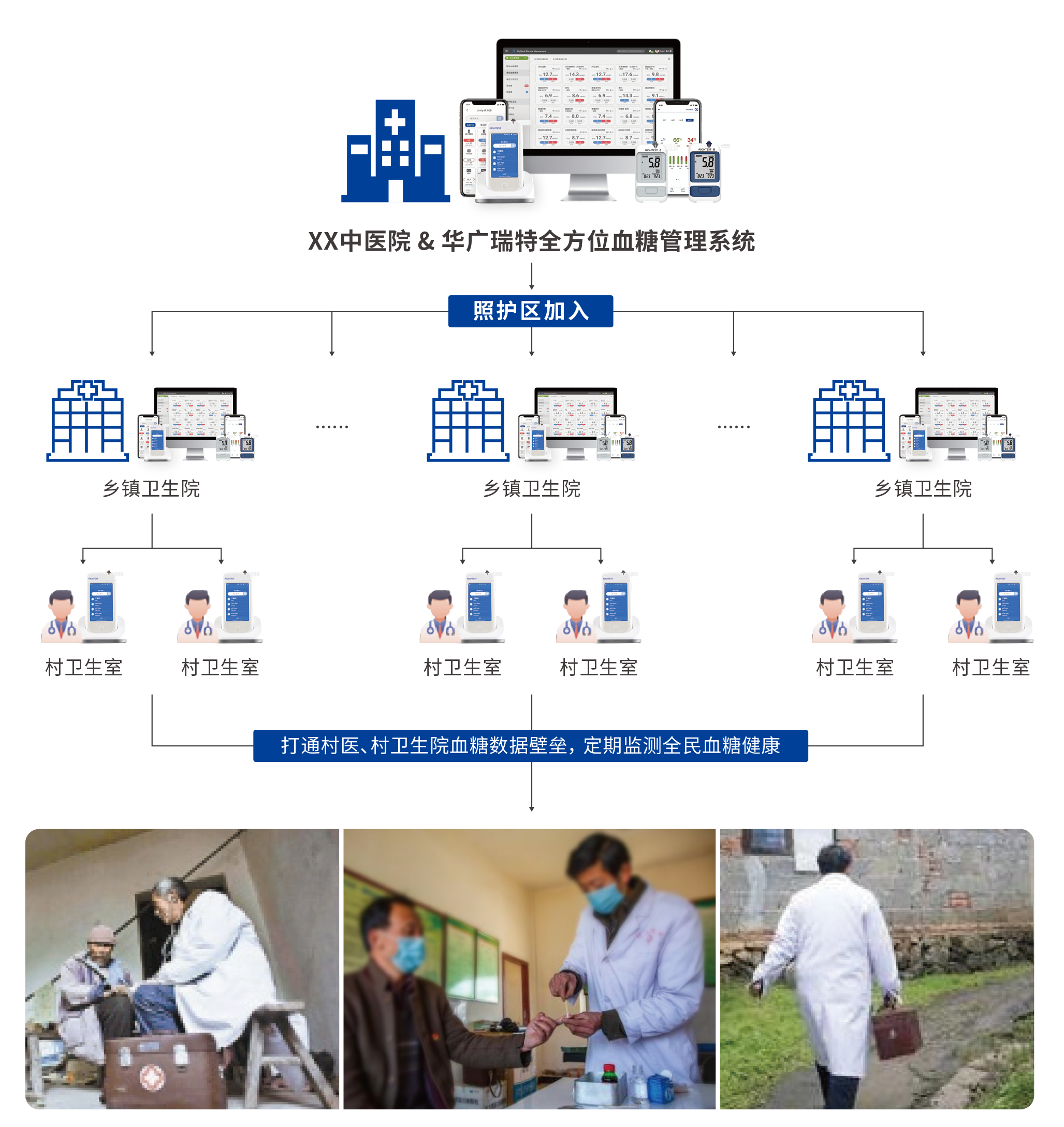 在分級(jí)診療的實(shí)踐探索中,華廣瑞特以全方位智能血糖管理系統(tǒng)為基礎(chǔ),構(gòu)建"三級(jí)醫(yī)院糖尿病診療中心+二級(jí)區(qū)級(jí)醫(yī)院+基層醫(yī)療衛(wèi)生服務(wù)機(jī)構(gòu)+家庭醫(yī)生"四級(jí)聯(lián)動(dòng)機(jī)制,形成覆蓋"市-區(qū)-社區(qū)"三級(jí)醫(yī)療網(wǎng)絡(luò)的糖尿病一體化管理閉環(huán)。該系統(tǒng)通過標(biāo)準(zhǔn)化診療路徑的數(shù)字化重構(gòu),實(shí)現(xiàn)患者全生命周期數(shù)據(jù)的無縫流轉(zhuǎn),推動(dòng)"以患者為中心"的整合型血糖管理模式落地,顯著提升了區(qū)域慢性病管理的服務(wù)效能和協(xié)同防控水平,為分級(jí)診療制度的深化實(shí)施提供了可復(fù)制、可推廣的實(shí)踐樣板。