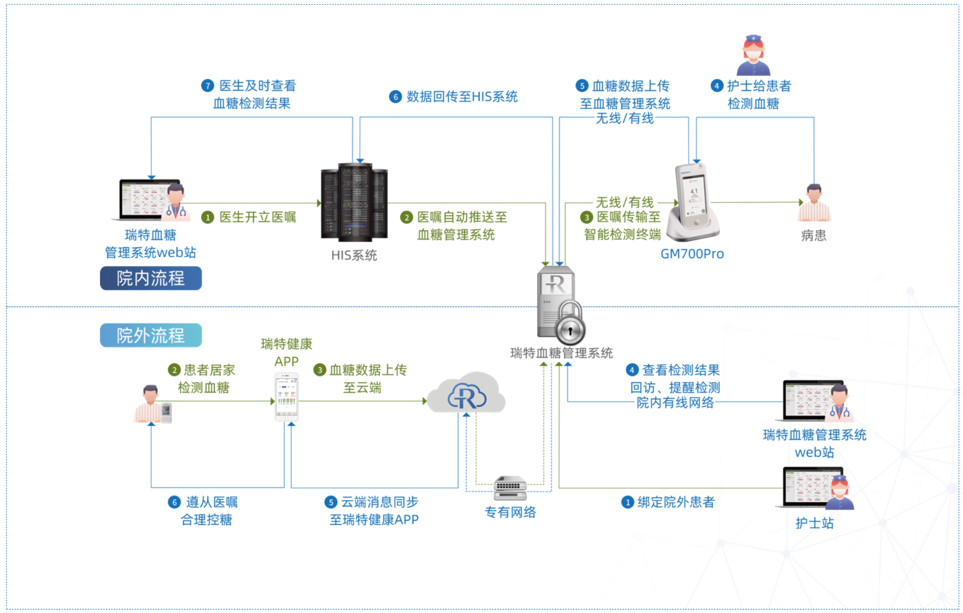 另一方面,瑞特“全方位智能血糖監(jiān)測(cè)管理系統(tǒng)”通過(guò)物聯(lián)網(wǎng)+模式,將醫(yī)院使用瑞特血糖儀GM700Pro、瑞特慢病管理系統(tǒng)及瑞特自我管理血糖儀與醫(yī)院HIS系統(tǒng)打通,實(shí)現(xiàn)了糖尿病人自我監(jiān)控到院內(nèi)門(mén)診、住院護(hù)理的無(wú)縫銜接和全智能化管理,構(gòu)建出一整套智能化血糖生態(tài)管理體系,讓醫(yī)生管理病患得心應(yīng)手,讓病人出院后照護(hù)持續(xù)不漏。通過(guò)瑞特管理系統(tǒng)的應(yīng)用,醫(yī)生更有治療成就感,患者更有就醫(yī)獲得感,真正達(dá)到了“智慧醫(yī)療”的目的。