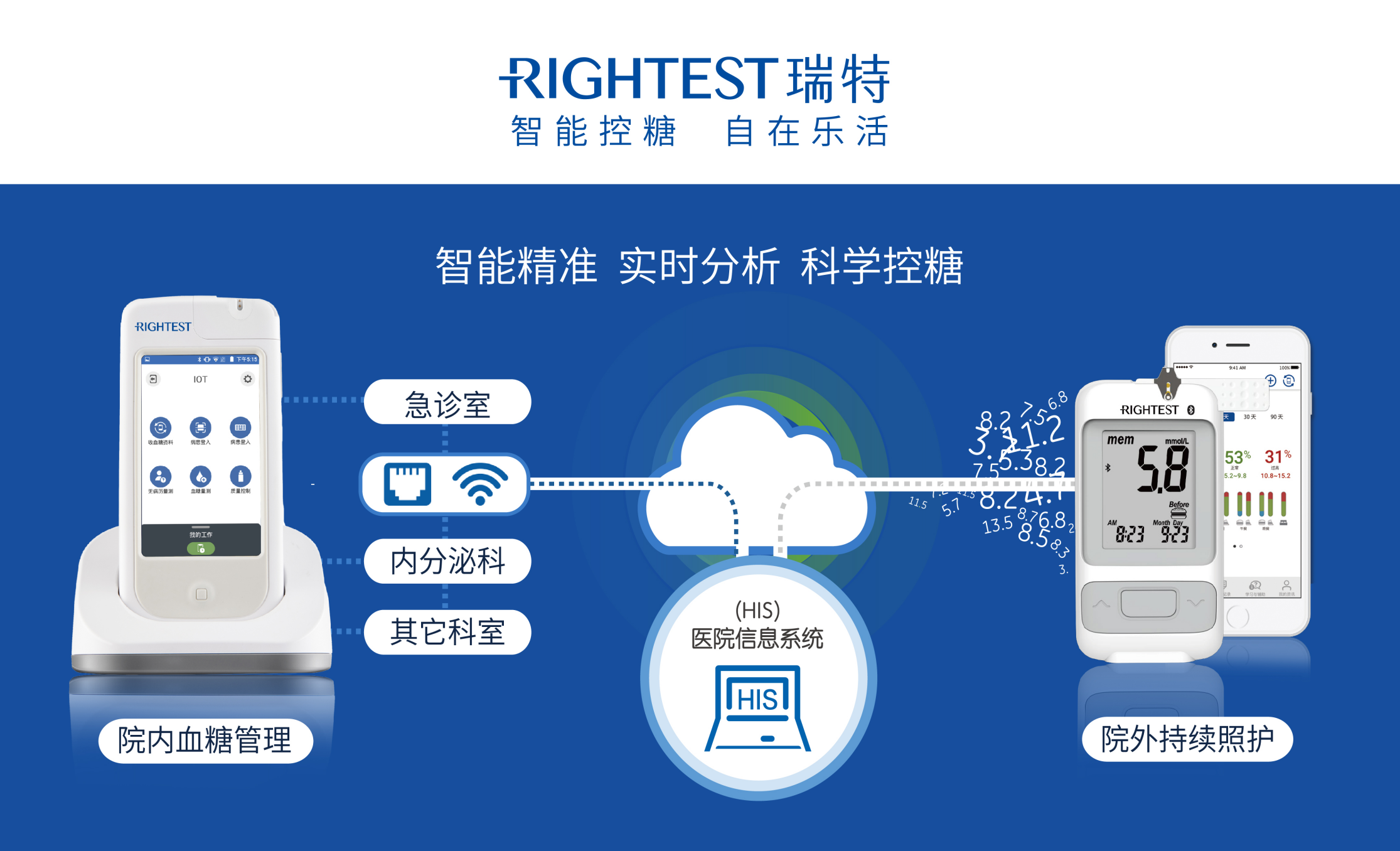 瑞特專為糖尿病患與專業醫療機構量身打造了"全方位智能血糖管理系統",支持與醫院HIS等院內信息系統單向或雙向信息傳輸。