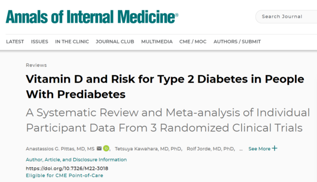 《內科學年鑒》(Annals of Internal Medicine)曾發表一項薈萃分析,表明糖尿病前期患者補充維生素D,有助于降低進展為糖尿病的風險。
